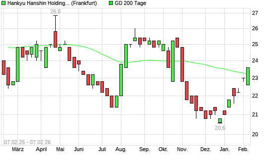 Mit dem Anstieg auf 23,60 EUR hat die Hankyu Hanshin Holdings-Aktie am 06.02.2026 die 200-Tage-Linie nach oben gekreuzt.Die Hankyu Hanshin Holdings-Aktie befand sich seit dem 29.10.2025 ...weiterlesen