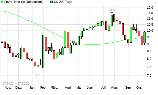 Mit dem Anstieg auf 9,65 EUR hat die Fever-Tree-Aktie am 16.10.2025 die 200-Tage-Linie nach oben gekreuzt.Die Fever-Tree-Aktie befand sich seit dem 07.10.2025 im langfristigen Abwärtstrend und ...weiterlesen
