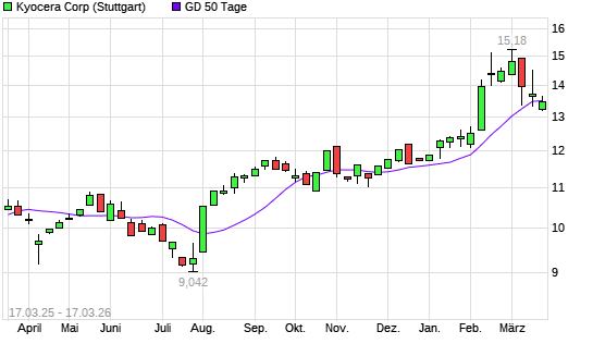 Mit dem Rücksetzer auf 12,98 EUR hat die Kyocera-Aktie am 16.03.2026 die 50-Tage-Linie nach unten gekreuzt.Die Kyocera-Aktie befindet sich seit dem 31.07.2025 im ...weiterlesen