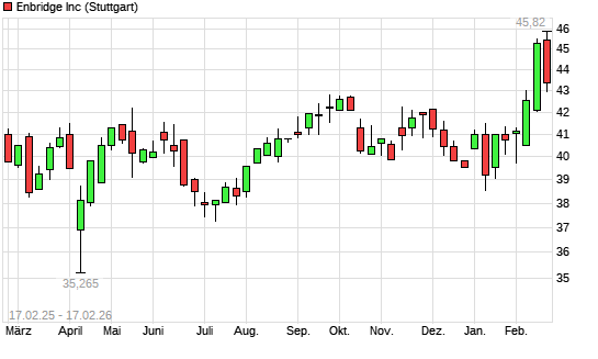 Mit dem Anstieg auf 45,82 EUR hat die Enbridge-Aktie (ISIN CA29250N1050) am 16.02.2026 ein neues 10-Jahres-Hoch erreicht und damit den Kurs vom 26.08.2022 eingestellt.Die ...weiterlesen