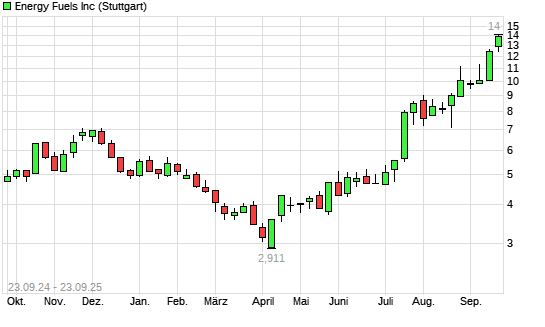Mit dem Anstieg auf 13,10 EUR hat die Energy Fuels-Aktie (ISIN CA2926717083) am 22.09.2025 ein neues 10-Jahres-Hoch erreicht und damit den Kurs vom 19.09.2025 eingestellt.Die Energy Fuels-Aktie ...weiterlesen