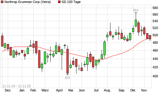 Mit dem Rücksetzer auf 484,90 EUR hat die Northrop Grumman-Aktie am 10.11.2025 die 100-Tage-Linie nach unten gekreuzt.Die Northrop Grumman-Aktie befindet sich seit dem 22.07.2025 im langfristigen ...weiterlesen