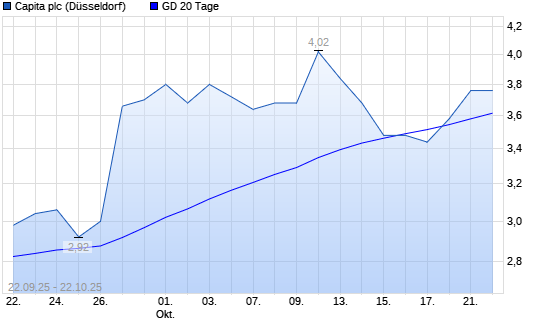 Mit dem Anstieg auf 3,44 EUR hat die Capita-Aktie am 21.10.2025 die 20-Tage-Linie nach oben gekreuzt.Die Capita-Aktie befindet sich seit dem 04.09.2025 im langfristigen Aufwärtstrend und hat ...weiterlesen