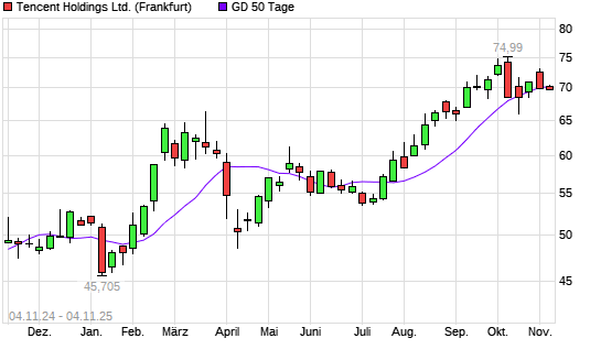 Mit dem Anstieg auf 70,36 EUR hat die Tencent-Aktie am 03.11.2025 die 50-Tage-Linie nach oben gekreuzt.Die Tencent-Aktie befindet sich seit dem 11.07.2025 im langfristigen Aufwärtstrend und ...weiterlesen