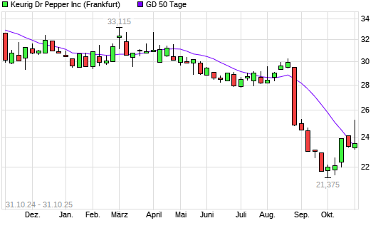 Mit dem Anstieg auf 23,84 EUR hat die Keurig Dr Pepper-Aktie am 30.10.2025 die 50-Tage-Linie nach oben gekreuzt.Die Keurig Dr Pepper-Aktie befindet sich seit dem 22.08.2025 im langfristigen ...weiterlesen