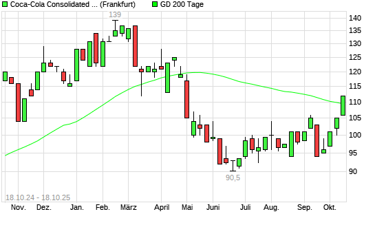 Mit dem Anstieg auf 112,00 EUR hat die COCA-COLA BOTTLING CO CONSOLID-Aktie am 17.10.2025 die 200-Tage-Linie nach oben gekreuzt.Die COCA-COLA BOTTLING CO CONSOLID-Aktie befand sich seit dem ...weiterlesen