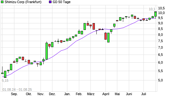 Mit dem Anstieg auf 9,75 EUR hat die Shimizu-Aktie am 31.07.2025 die 50-Tage-Linie nach oben gekreuzt.Die Shimizu-Aktie befindet sich seit dem 22.08.2024 im langfristigen Aufwärtstrend und hat ...weiterlesen