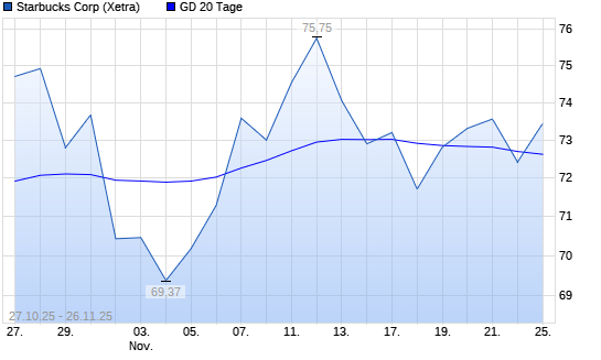 Mit dem Anstieg auf 74,18 EUR hat die Starbucks-Aktie am 25.11.2025 die 20-Tage-Linie nach oben gekreuzt.Die Starbucks-Aktie befindet sich seit dem 03.04.2025 im langfristigen Abwärtstrend und ...weiterlesen