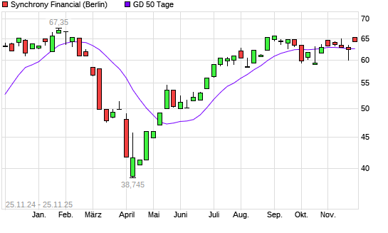 Mit dem Anstieg auf 65,30 EUR hat die Synchrony Financial-Aktie am 24.11.2025 die 50-Tage-Linie nach oben gekreuzt.Die Synchrony Financial-Aktie befindet sich seit dem 24.06.2025 im langfristigen ...weiterlesen
