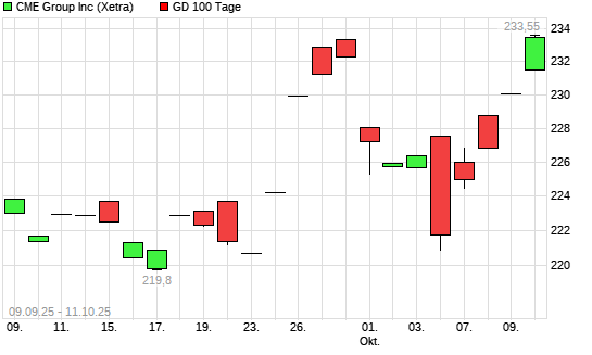 Mit dem Anstieg auf 234,50 EUR hat die CME Group-Aktie am 10.10.2025 die 100-Tage-Linie nach oben gekreuzt.Die CME Group-Aktie befindet sich seit dem 22.08.2025 im langfristigen Abwärtstrend ...weiterlesen
