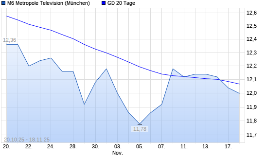Mit dem Anstieg auf 12,20 EUR hat die M6 Metropole Television-Aktie am 17.11.2025 die 20-Tage-Linie nach oben gekreuzt.Die M6 Metropole Television-Aktie befindet sich seit dem 24.09.2025 im ...weiterlesen