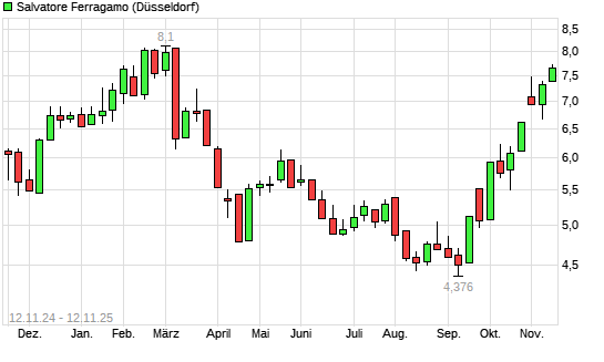 Mit dem Anstieg auf 7,59 EUR hat die Salvatore Ferragamo-Aktie (ISIN IT0004712375) am 11.11.2025 ein neues 6-Monats-Hoch erreicht und damit den Kurs vom 10.11.2025 eingestellt.Die Salvatore ...weiterlesen