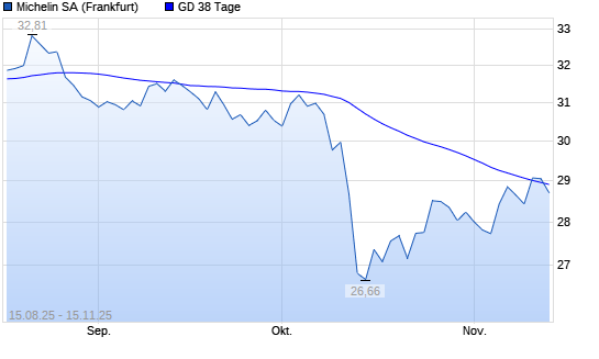 Mit dem Rücksetzer auf 28,70 EUR hat die Michelin-Aktie am 14.11.2025 die 38-Tage-Linie nach unten gekreuzt.Die Michelin-Aktie befindet sich seit dem 26.08.2025 im langfristigen Abwärtstrend ...weiterlesen