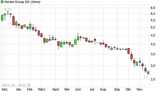 Mit dem Rücksetzer auf 2,68 EUR hat die Novem Group-Aktie (ISIN LU2356314745) am 17.11.2025 ein neues All-Time-Low erreicht und damit den Kurs vom 11.11.2025 eingestellt.Die Novem Group-Aktie ...weiterlesen