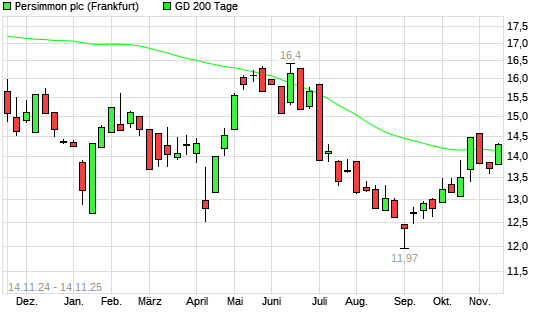 Mit dem Rücksetzer auf 13,93 EUR hat die Persimmon-Aktie am 13.11.2025 die 200-Tage-Linie nach unten gekreuzt.Die Persimmon-Aktie befand sich seit dem 12.11.2025 im langfristigen Aufwärtstrend ...weiterlesen
