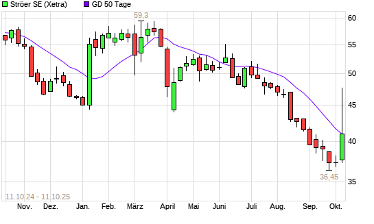 Mit dem Anstieg auf 42,05 EUR hat die Ströer-Aktie am 10.10.2025 die 50-Tage-Linie nach oben gekreuzt.Die Ströer-Aktie befindet sich seit dem 05.06.2025 im langfristigen Abwärtstrend und ...weiterlesen