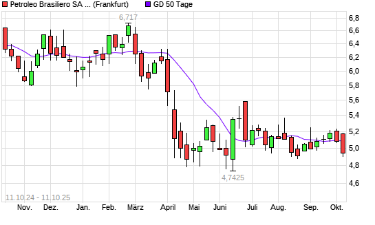 Mit dem Rücksetzer auf 4,94 EUR hat die Petroleo Brasileiro-Aktie am 10.10.2025 die 50-Tage-Linie nach unten gekreuzt.Die Petroleo Brasileiro-Aktie befindet sich seit dem 02.04.2025 im ...weiterlesen