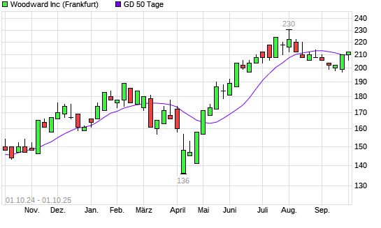 Mit dem Anstieg auf 212,00 EUR hat die Woodward-Aktie am 30.09.2025 die 50-Tage-Linie nach oben gekreuzt.Die Woodward-Aktie befindet sich seit dem 29.04.2025 im langfristigen Aufwärtstrend und ...weiterlesen