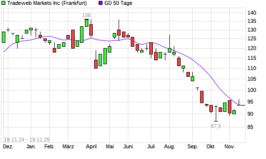Mit dem Anstieg auf 94,50 EUR hat die Tradeweb Markets-Aktie am 18.11.2025 die 50-Tage-Linie nach oben gekreuzt.Die Tradeweb Markets-Aktie befindet sich seit dem 31.07.2025 im langfristigen ...weiterlesen