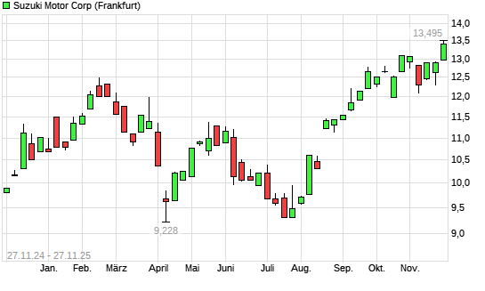 Mit dem Anstieg auf 13,49 EUR hat die Suzuki Motor-Aktie (ISIN JP3397200001) am 26.11.2025 ein neues 5-Jahres-Hoch erreicht und damit den Kurs vom 25.11.2025 eingestellt.Die Suzuki Motor-Aktie ...weiterlesen