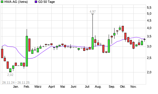 Mit dem Rücksetzer auf 3,22 EUR hat die HWA-Aktie am 25.11.2025 die 50-Tage-Linie nach unten gekreuzt.Die HWA-Aktie befindet sich seit dem 19.11.2025 im langfristigen Aufwärtstrend und ...weiterlesen