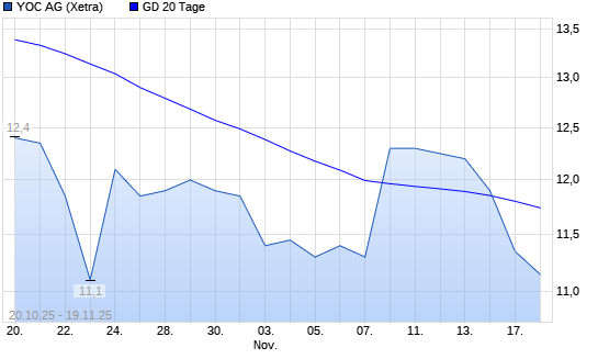 Mit dem Rücksetzer auf 11,00 EUR hat die YOC-Aktie am 18.11.2025 die 20-Tage-Linie nach unten gekreuzt.Die YOC-Aktie befindet sich seit dem 24.07.2025 im langfristigen Abwärtstrend und ...weiterlesen