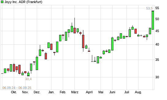 Mit dem Anstieg auf 53,50 EUR hat die JOYY-Aktie (ISIN US46591M1099) am 05.09.2025 ein neues 3-Jahres-Hoch erreicht und damit den Kurs vom 04.09.2025 eingestellt.Die JOYY-Aktie befindet sich ...weiterlesen