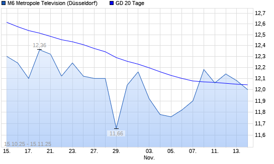 Mit dem Rücksetzer auf 11,88 EUR hat die M6 Metropole Television-Aktie am 14.11.2025 die 20-Tage-Linie nach unten gekreuzt.Die M6 Metropole Television-Aktie befindet sich seit dem 24.09.2025 ...weiterlesen