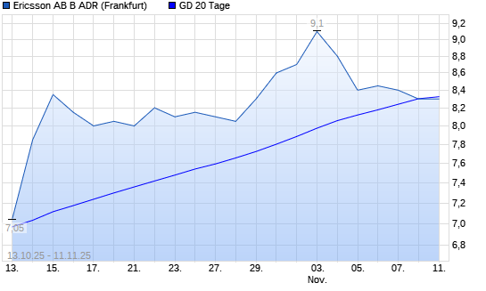 Mit dem Rücksetzer auf 8,30 EUR hat die Ericsson B ADR-Aktie am 10.11.2025 die 20-Tage-Linie nach unten gekreuzt.Die Ericsson B ADR-Aktie befindet sich seit dem 14.10.2025 im langfristigen ...weiterlesen