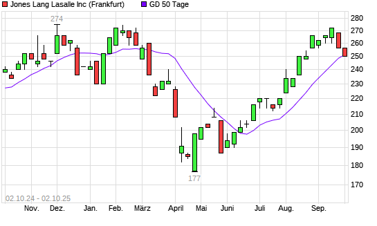 Mit dem Rücksetzer auf 250,00 EUR hat die Jones Lang LaSalle-Aktie am 01.10.2025 die 50-Tage-Linie nach unten gekreuzt.Die Jones Lang LaSalle-Aktie befindet sich seit dem 05.08.2025 im ...weiterlesen