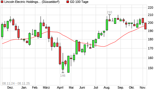 Mit dem Rücksetzer auf 193,00 EUR hat die Lincoln Electric-Aktie am 07.11.2025 die 100-Tage-Linie nach unten gekreuzt.Die Lincoln Electric-Aktie befindet sich seit dem 03.07.2025 im langfristigen ...weiterlesen