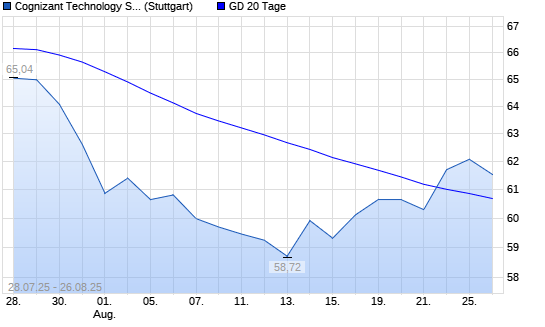 Mit dem Anstieg auf 61,53 EUR hat die Cognizant-Aktie am 25.08.2025 die 20-Tage-Linie nach oben gekreuzt.Die Cognizant-Aktie befindet sich seit dem 30.05.2025 im langfristigen Abwärtstrend und ...weiterlesen