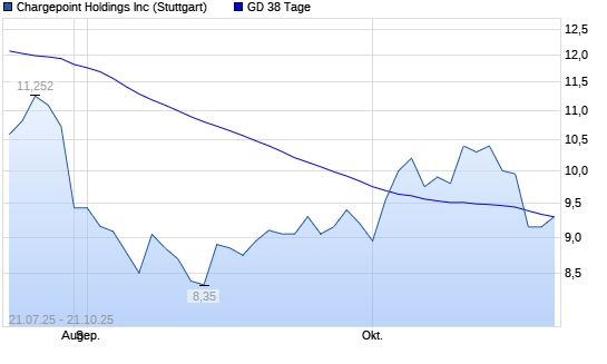 Mit dem Rücksetzer auf 9,20 EUR hat die ChargePoint Holdings-Aktie am 20.10.2025 die 38-Tage-Linie nach unten gekreuzt.Der Abstand zur 200-Tage-Linie beträgt aktuell -23,68%.