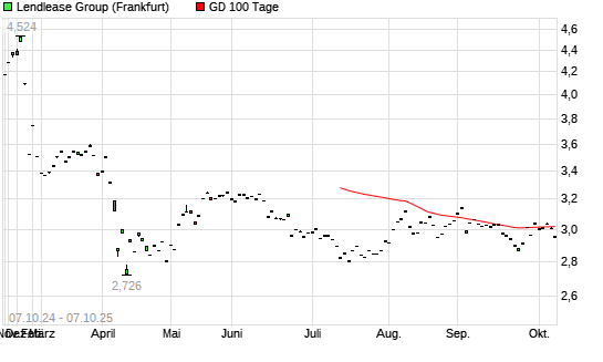 Mit dem Rücksetzer auf 3,00 EUR hat die Lendlease Group-Aktie am 06.10.2025 die 100-Tage-Linie nach unten gekreuzt.Die Lendlease Group-Aktie befindet sich seit dem 25.02.2025 im langfristigen ...weiterlesen