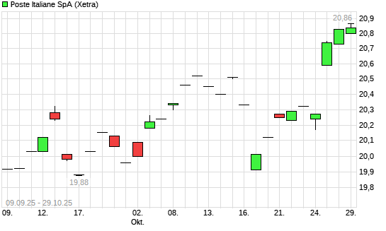 Mit dem Anstieg auf 20,81 EUR hat die Poste Italiane-Aktie (ISIN IT0003796171) am 28.10.2025 ein neues All-Time-High erreicht und damit den Kurs vom 27.10.2025 eingestellt.Die Poste Italiane-Aktie ...weiterlesen