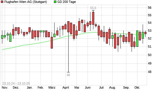Mit dem Anstieg auf 53,20 EUR hat die Flughafen Wien-Aktie am 22.10.2025 die 200-Tage-Linie nach oben gekreuzt.Die Flughafen Wien-Aktie befand sich seit dem 20.10.2025 im langfristigen Abwärtstrend ...weiterlesen