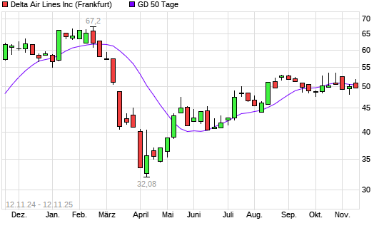 Mit dem Rücksetzer auf 50,53 EUR hat die Delta Air Lines-Aktie am 11.11.2025 die 50-Tage-Linie nach unten gekreuzt.Die Delta Air Lines-Aktie befindet sich seit dem 03.10.2025 im langfristigen ...weiterlesen