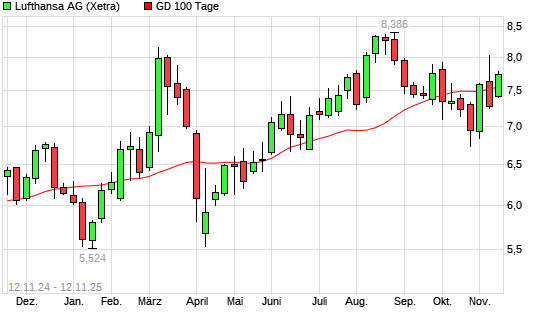 Mit dem Anstieg auf 7,70 EUR hat die Lufthansa-Aktie am 11.11.2025 die 100-Tage-Linie nach oben gekreuzt.Die Lufthansa-Aktie befindet sich seit dem 30.10.2025 im langfristigen Aufwärtstrend ...weiterlesen