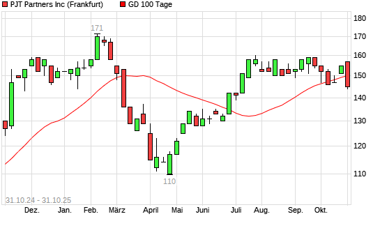 Mit dem Rücksetzer auf 145,00 EUR hat die PJT Partners-Aktie am 30.10.2025 die 100-Tage-Linie nach unten gekreuzt.Die PJT Partners-Aktie befindet sich seit dem 03.07.2025 im langfristigen ...weiterlesen