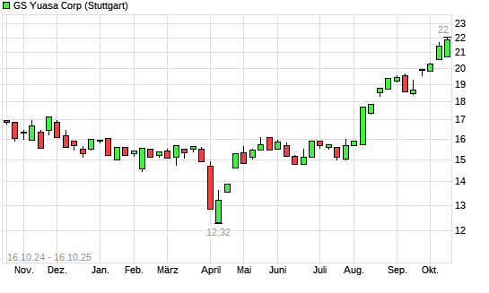 Mit dem Anstieg auf 21,86 EUR hat die Gs Yuasa-Aktie (ISIN JP3385820000) am 15.10.2025 ein neues 3-Jahres-Hoch erreicht und damit den Kurs vom 09.10.2025 eingestellt.Die Gs Yuasa-Aktie befindet ...weiterlesen