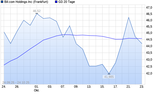 Mit dem Rücksetzer auf 44,21 EUR hat die Bill.com Holdings-Aktie am 23.10.2025 die 20-Tage-Linie nach unten gekreuzt.Die Bill.com Holdings-Aktie befindet sich seit dem 12.02.2025 im langfristigen ...weiterlesen