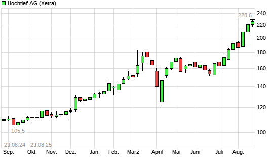 Mit dem Anstieg auf 226,40 EUR hat die Hochtief-Aktie (ISIN DE0006070006) am 22.08.2025 ein neues All-Time-High erreicht und damit den Kurs vom 18.08.2025 eingestellt.Die Hochtief-Aktie befindet ...weiterlesen