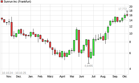 Mit dem Anstieg auf 17,48 EUR hat die Sunrun-Aktie (ISIN US86771W1053) am 09.10.2025 ein neues 12-Monats-Hoch erreicht und damit den Kurs vom 08.10.2025 eingestellt.Die Sunrun-Aktie befindet ...weiterlesen