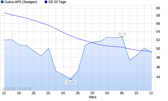 Mit dem Rücksetzer auf 48,94 EUR hat die Gubra-Aktie am 11.03.2026 die 20-Tage-Linie nach unten gekreuzt.Die Gubra-Aktie befindet sich seit dem 06.02.2026 im ...weiterlesen