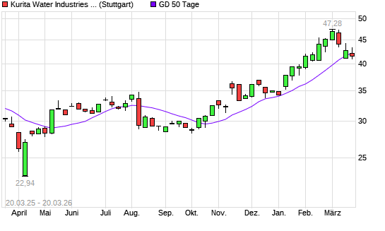 Mit dem Rücksetzer auf 41,80 EUR hat die Kurita Water Industries-Aktie am 19.03.2026 die 50-Tage-Linie nach unten gekreuzt.Die Kurita Water Industries-Aktie befindet sich seit ...weiterlesen