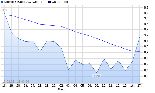 Mit dem Anstieg auf 8,84 EUR hat die Koenig & Bauer-Aktie am 17.03.2026 die 20-Tage-Linie nach oben gekreuzt.Die Koenig & Bauer-Aktie befindet sich seit dem 02.09.2025 im ...weiterlesen