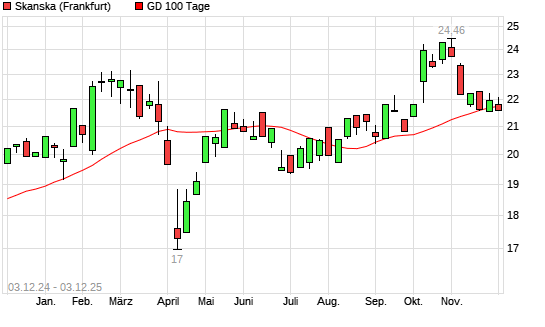 Mit dem Rücksetzer auf 21,65 EUR hat die Skanska-Aktie am 02.12.2025 die 100-Tage-Linie nach unten gekreuzt.Die Skanska-Aktie befindet sich seit dem 09.09.2025 im langfristigen Aufwärtstrend ...weiterlesen