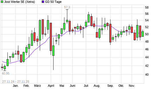 Mit dem Anstieg auf 50,90 EUR hat die JOST Werke-Aktie am 26.11.2025 die 50-Tage-Linie nach oben gekreuzt.Die JOST Werke-Aktie befindet sich seit dem 18.11.2025 im langfristigen Abwärtstrend ...weiterlesen
