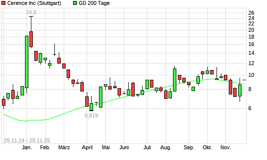 Mit dem Anstieg auf 9,26 EUR hat die Cerence-Aktie am 24.11.2025 die 200-Tage-Linie nach oben gekreuzt.Die Cerence-Aktie befand sich seit dem 21.11.2025 im langfristigen Abwärtstrend und hat ...weiterlesen