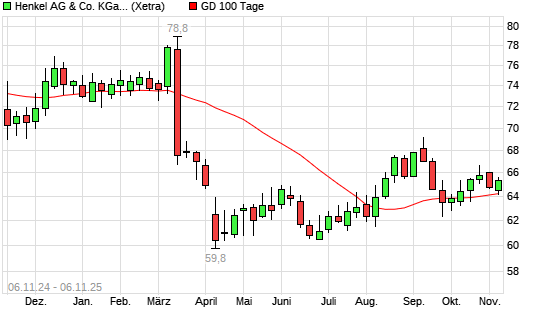 Mit dem Anstieg auf 64,70 EUR hat die Henkel St-Aktie am 05.11.2025 die 100-Tage-Linie nach oben gekreuzt.Die Henkel St-Aktie befindet sich seit dem 23.10.2025 im langfristigen Abwärtstrend ...weiterlesen